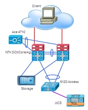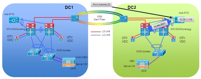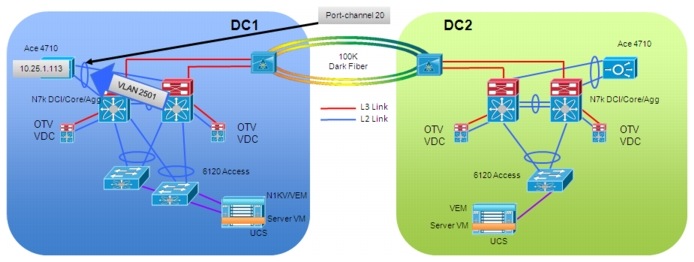 •A separate ACE is deployed in each data center site. The ACE is connected to the aggregation layer devices leveraging a vPC connection. Traffic from the client enters the ACE via a L3 VLAN across the vPC.