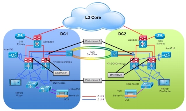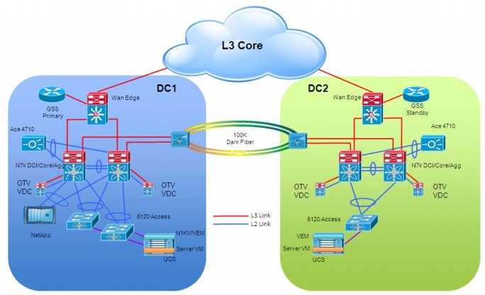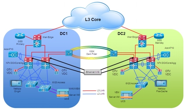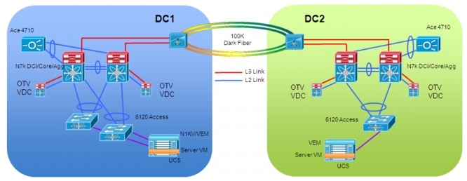 •Provisioning of Layer 2 and Layer 3 connectivity leveraging the same dark fiber connections reduces the number of dark fiber required between the data centers.