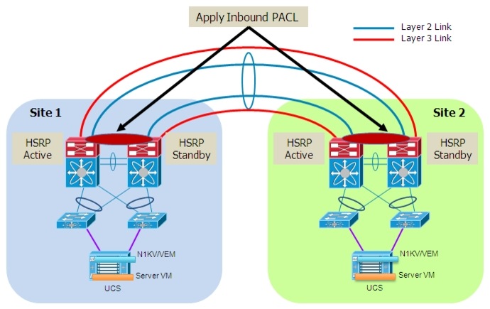For the vPC over dark fiber model discussed above, inbound port access lists (PACL) are used. Figure 1-6 highlights the specific case where HSRP is used as the FHRP on the Nexus 7000 devices acting as default gateway for all the hosts.