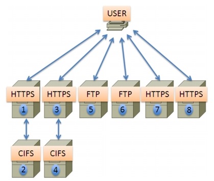 In the single tier deployment, client requests (HTTP or FTP) would hit the ACE load balancer then be sent directly to the HTTP or FTP application server. The HTTP or FTP server would serve data from it's NFS-mounted storage back to the client (Figure 1-2).