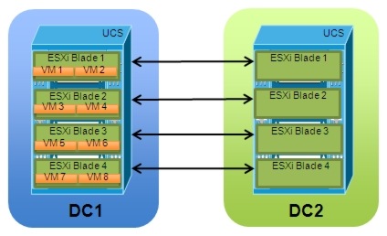 The ESXi hosts in the topology are configured so that there is only one ESXi cluster across DC1 and DC2. In a single cluster, vSphere 4.1 can support 8 concurrent vMotions when the bandwidth between the ESXi hosts is 10Gbps.
