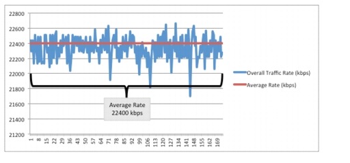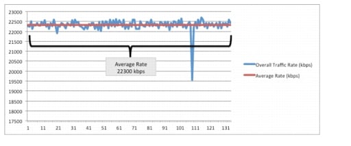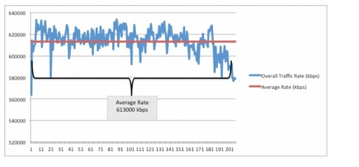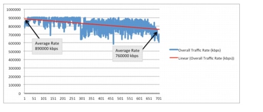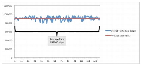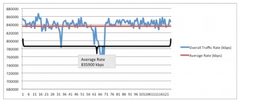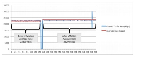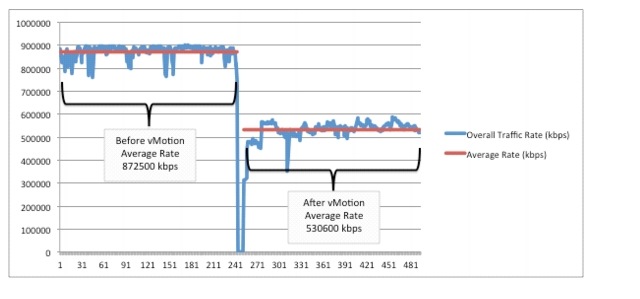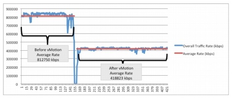 Figure 1-67 shows the cumulative rate of the VM servers' throughput rates, in kbps, before and after the vMotion occurs. Notice that before the vMotion occurred, the application traffic was at an average rate of 812750 kbps, however after the vMotion occurred, the rate decreased to an average of 418823 kbps which is a decrease of 48.5% in performance.
