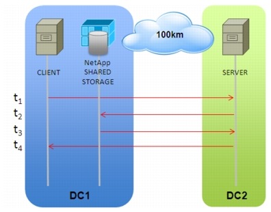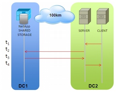 When the server is located in DC1 and the client enters DC1, none of the traffic traverses the 100km distance between the data centers since the server and storage are both located in the same data center.