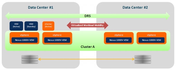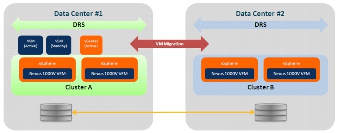 Nexus 1000V allows policy to move with a virtual machine during live migration, ensuring persistent network, security, and storage compliance, resulting in improved business continuance, performance management, and security compliance. A single Nexus 1000V should be deployed between the data centers to allow for the policy profiles to migrate with the VM. This removes the need to any rebuilding of policy definitions by the user and thus increases the speed and efficiency of the workload move. The active and standby VSM for the Nexus 1000V should be deployed in the same data center.