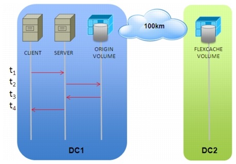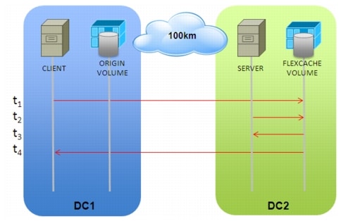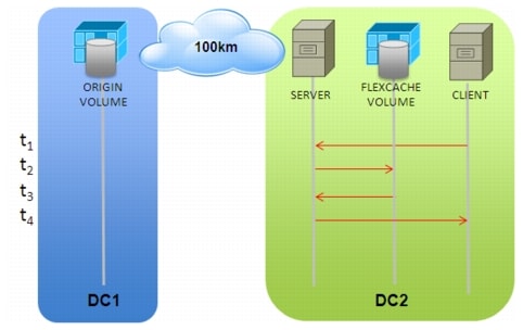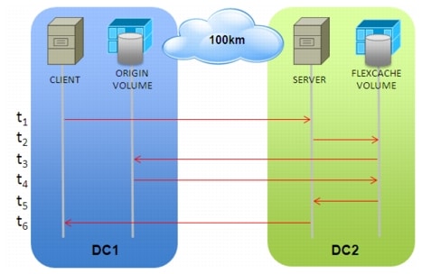 The NetApp FlexCache initially does not have the files in the cache, which results in a cache miss and therefore must go back to DC1 to retrieve the files the first time. This will give performance similar to shared storage since the DCI link must be traversed 4 times.