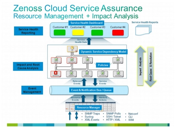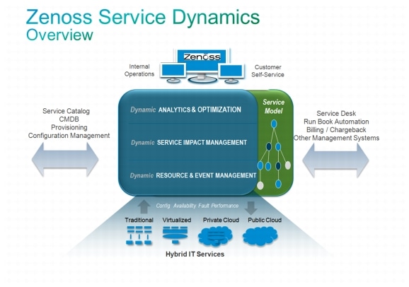 The foundation of service assurance in the hybrid cloud DC is unified, cross-domain resource monitoring and control that brings together configuration, performance, availability, fault, event and log information across the physical, virtual and cloud-based infrastructure and applications, and enables automated actions to be performed at the resource level. Zenoss Service Dynamics delivers this capability on a scalable, open platform that is easy to extend, and is able to track dynamic elements and relationships as they evolve in near real time.
