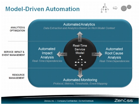 The core issue in the cloud DC is keeping up with its rapid rate of change. When a customer's order for a new IT service is automatically fulfilled and placed into production, there is no time to manually update tools or components. At the heart of Zenoss Service Dynamics is a unified, real-time understanding of the entire IT environment, including resources, services, relationships, dependencies, state, and configuration. With this understanding, Zenoss is able to simplify the service assurance process with template-driven resource monitoring and automated impact and RCA. Unlike traditional systems that rely on configuration databases that are updated in batch mode, the Zenoss model is maintained in near real time through a series of discovery and modeling techniques that tap into the stream of configuration changes as they happen across the physical, virtual, and cloud-based infrastructure. Like every other aspect of the product, this model can be extended through its open API.