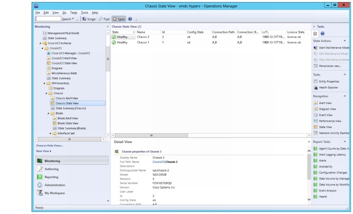 In SCOM, users can view Private Cloud status and configuration information. Users can view the Cisco UCS folder for UCS status and configuration information. In order to minimize downtime, users can create e-mail alerts that report UCS failures.