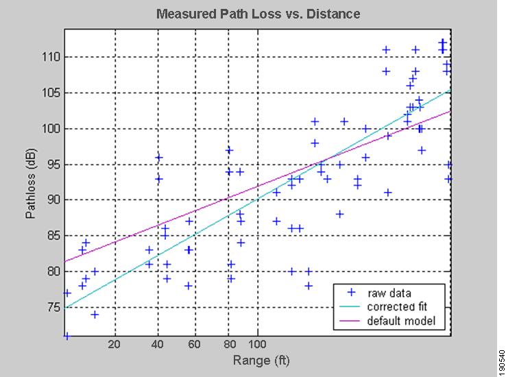 The data accumulated during the calibration phase is statistically processed and groomed, then used to build an RF propagation model used to predict tracked device RSSI around each access point, where the path loss exponent, shadow fading standard deviation, and PL1meter values are calculated from the sample calibration data so as to better reflect specific propagation anomalies present in the environment. This process consists of several computational cycles where the previously-mentioned parameters are calculated for each band. The minimum mean square error (MMSE) estimation technique is used to obtain the initial values for the parameters, as shown in Figure 3-1, where the path loss exponent is represented by the slope of the applicable MMSE line of best fit (that is, either default or corrected fit). However, note that in the RF Fingerprinting approach, the selection of a location path loss model does not end with MMSE. Rather, MMSE is used only as the starting point for the selection of finalized parameters for each band, with the ultimate goal being the optimization of the final path loss model as it pertains to location accuracy. RF Fingerprinting does not rely on good location performance being a by-product of a RF propagation model that simply provides good coverage mapping.