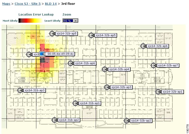 Simultaneous tracking of multiple devices on a floor map. Location tracking services will be available only as an on-demand service and only for a single device at a time. Figure 3-6 illustrates the use of on-demand localization for a single WLAN client. When using on-demand localization in this manner, it should be noted that colors surrounding the device icon provide an idea of the degree of location error associated with the icon placement. The darker colors surrounding the icon represent those areas where confidence is high (the probability is higher that the device is physically located where the icon is placed or within this area). The lighter colors represent those areas of lower confidence (the probability is lower that the device is physically located within these areas).