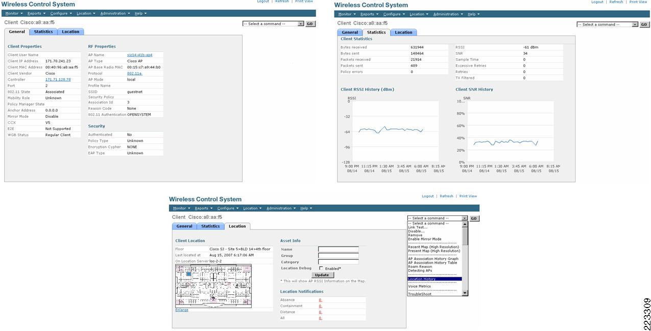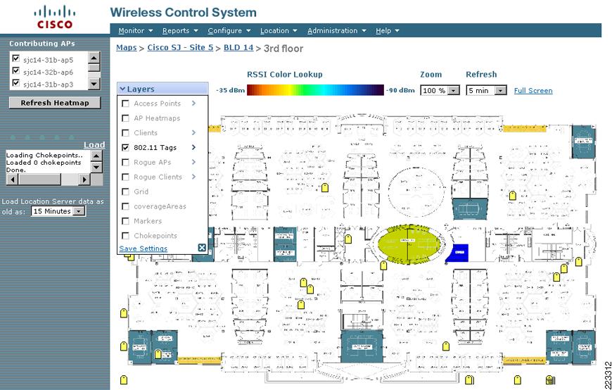 WCS—WCS serves as the default location client to the location appliance, providing location display capabilities that can satisfy most IT-centric and network monitoring requirements. The inherent flexibility afforded by the location appliance API allows for third-party location clients to reside in the UWN in a complementary fashion to WCS. These third-party products may provide a very business-focused UI that concentrates on the management of assets and de-emphasizes the details of RFID, localization and network management.