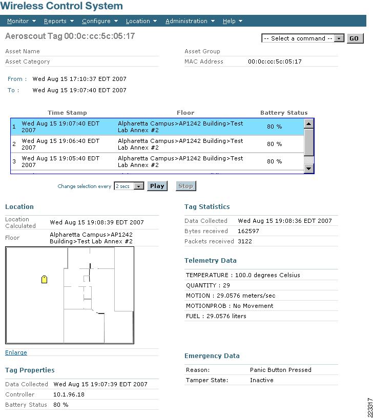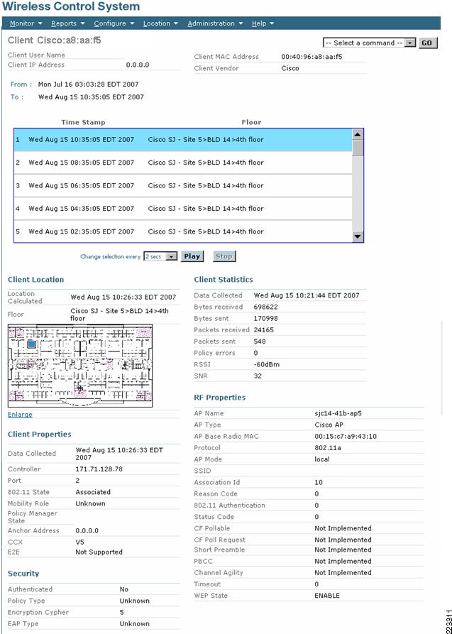 In many cases, it is desirable to sequentially display the location history of an asset tag so as to better visualize and trace the movement of the asset tag (and the attached asset) throughout the environment over time. This can be very useful, for example, in establishing a trail of motion in security and monitoring applications. Cisco WCS and the location appliance make it possible to do this by playing back each location history record with a configurable time delay. The granularity of the "movement" shown depends on the interval with which client history records are recorded in the database.