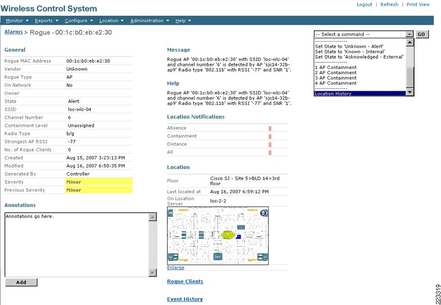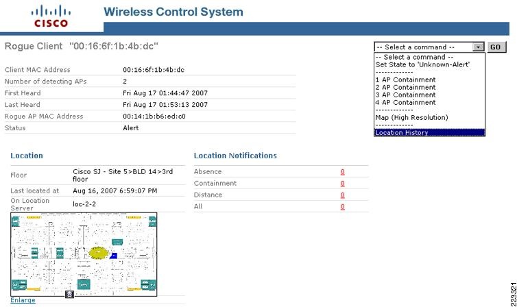 Using the dropdown menu located in the upper right-hand corner, you can access location history and playback information for the rogue client that is similar in format and function to that described previously for WLAN clients, active RFID tags and rogue access points.