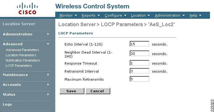 Maximum Retransmits—The maximum number of retransmissions that will be attempted by the location appliance when a response is not received for a LOCP Request. Valid values are 1 to 99,999 attempts, with the default value being 5 attempts.