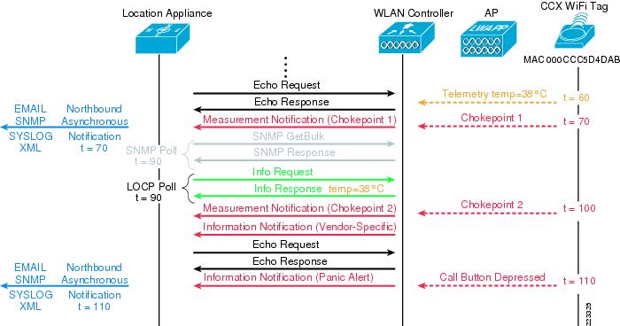 Beginning with software Release 4.1 of the location-aware Cisco UWN, LOCP provides for the transmission of asynchronous high-priority messages from the WLAN controller to the location appliance. Included in this category are high-priority tag events such as tag call button alerts, chokepoint proximity and vendor-specific tag payloads.