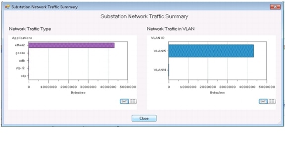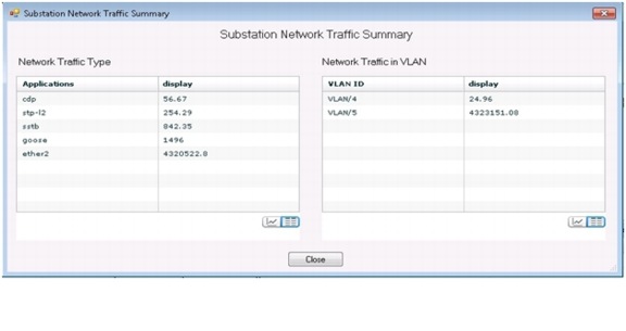 The Network Traffic tool evaluates the traffic in the substation network and reports the findings by type and volume. The report is available in graphical and tabular form. The icon in the lower right corner of each pane switches the display from one presentation to another.