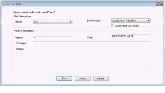 The Version Bind Dialog Box Allows Creation and Abandoning of Binds