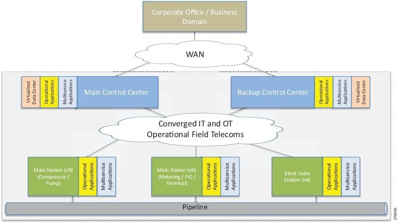 Oil and Gas pipelines (Figure 1-3) comprise operating process, safety, and energy management functions geographically spread along the pipeline for a set of stations. Stations vary in size and function, but typically include large compressor or pump stations, mid-size metering stations, Pipeline Inspection Gauge (PIG) terminal stations, and smaller block valve stations. Each process and application must be linked with the applications and processes at other stations, and at the Control Centers (main and backup) through an operational field telecoms infrastructure. The process must be done in a reliable and efficient way, avoiding communications outages and data losses. The Control Centers should also be securely connected to the enterprise through a Wide Area Network (WAN) to allow users to improve operational processes, streamline business planning, and optimize energy consumption.