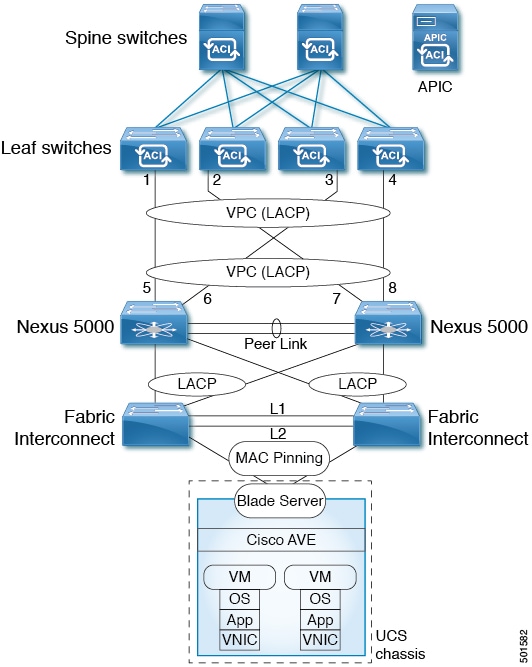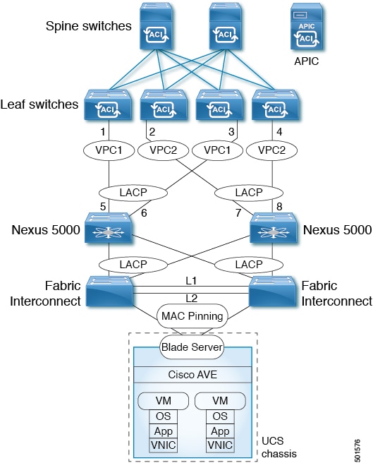 This topology connects the ESXi hypervisor to the Cisco APIC using Cisco UCS Fabric Interconnects, VPCs, LACP, and MAC pinning.