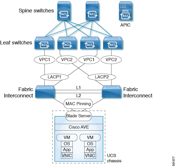 In this topology, the Cisco ACI Virtual Edge can be configured only with MAC pinning. That is because Cisco UCS Fabric Interconnects do not support LACP on the southbound ports toward the blade server. Therefore, the illustration shows MAC pinning only on the Cisco ACI Virtual Edge side.