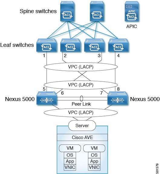 You also can have leaf switches and Cisco Nexus 5000 switches connected in a single-side VPC topology. |