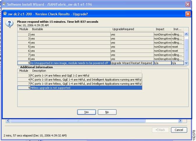 If the switching module(s) are not compatible with the new supervisor module image, some traffic disruption may be noticed in the related modules, depending on your configuration. These modules are identified in the summary when you use the Installation Wizard. You can choose to proceed with the upgrade or end at this point.