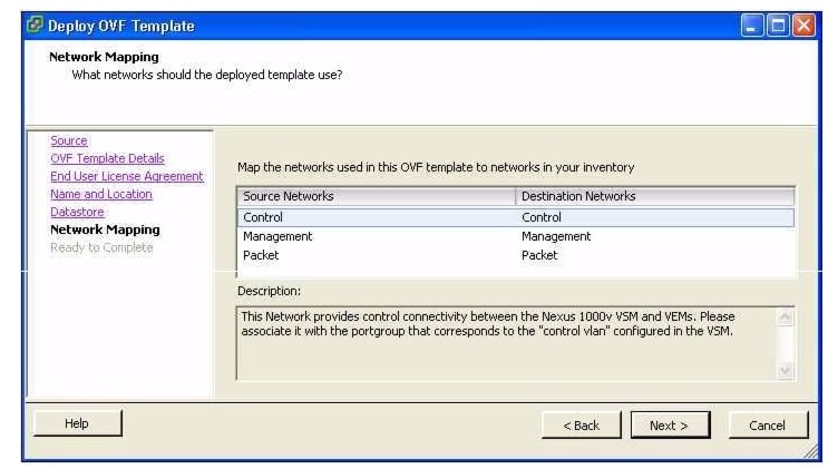 In the Network Mapping window, choose the networks (the control, management, and packet port groups) that are present in your inventory and click Next.