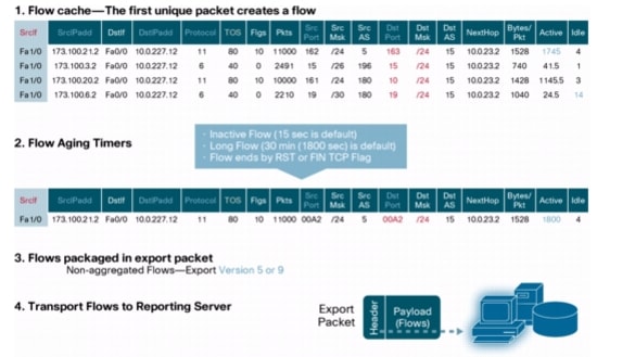 A flow is a one-directional stream of packets that arrives on a source interface (or subinterface), matching a set of criteria. All packets with the same source/destination IP address, source/destination ports, protocol interface and class of service are grouped into a flow and then packets and bytes are tallied. This condenses a large amount of network information into a database called the NetFlow cache.