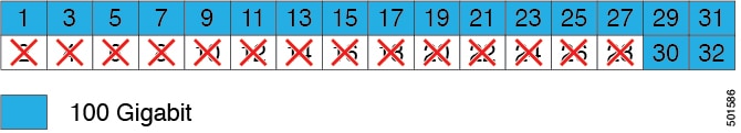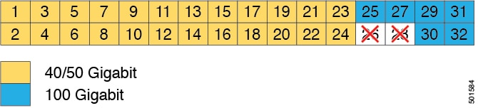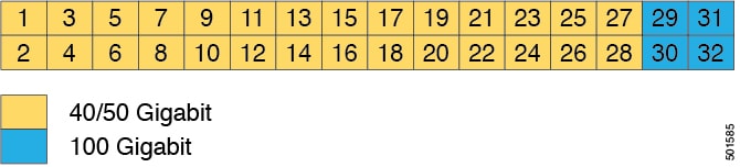 This switch has 32 ports of which 28 are configured as 40/50-Gigabit ports and 4 are configured as 40/100-Gigabit ports. You can change the ways that these ports are used by using templates to configure all the ports in commonly used ways or by configuring ports individually. Three of the templates that you can use are the following: