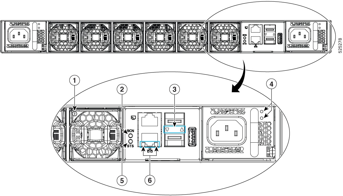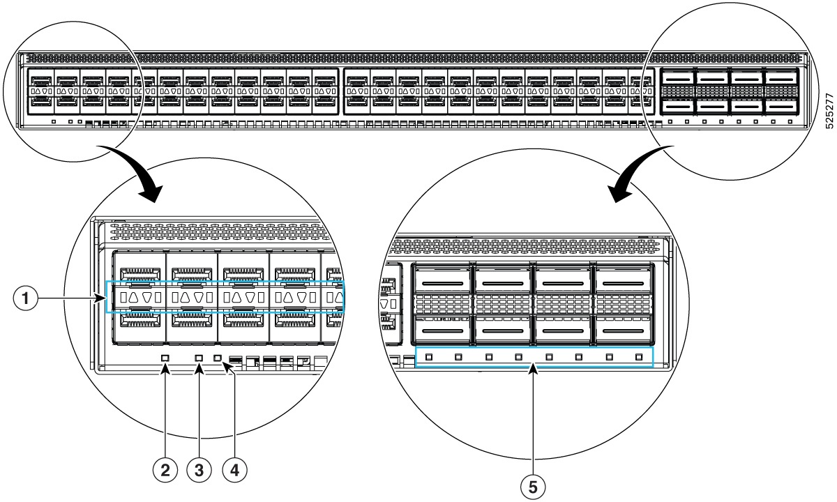 The SFP port, BCN, STS, ENV, and QFP LEDs are located on the right side of the front of the switch. The SFP port LEDs appear as triangles pointing up or down to the nearest port. The Power Supply and Fan Module LEDs are located on the rear of the switch.