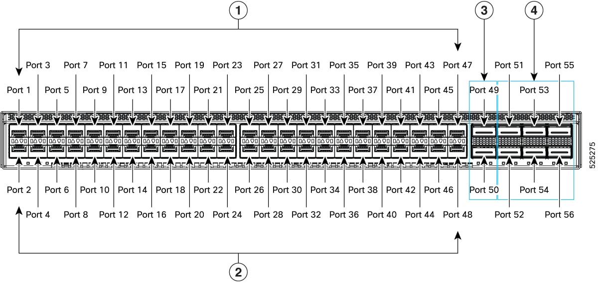6 x 400 GE (QSFP-DD) ports (ports 51-56)