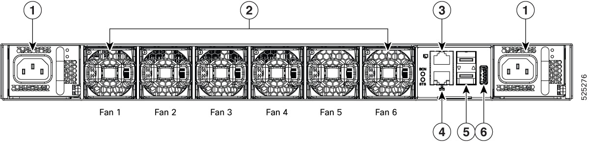 The figure shows the switch features on the power supply side of the chassis, the back view.