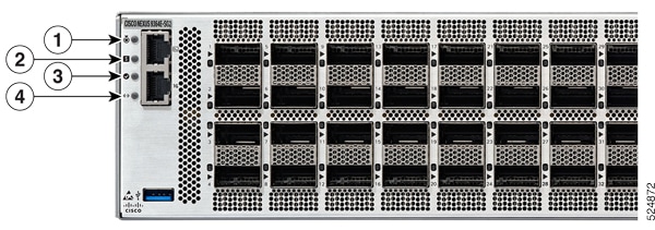 The BCN, STS, and ENV, LEDs are located on the left side of the front of the switch. The port LEDs appear as triangles pointing up or down to the nearest port.