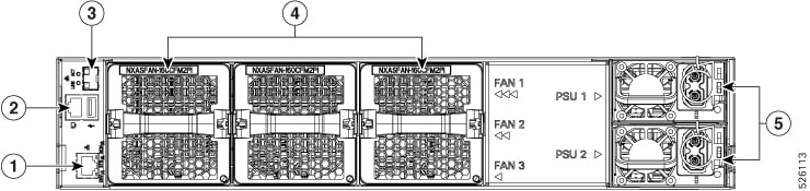 Console management ( 1 —RJ-45 copper port) and USB port (1). |