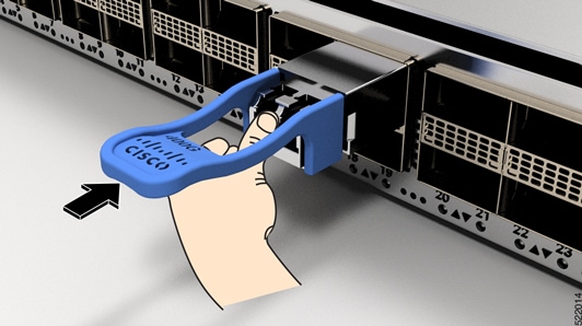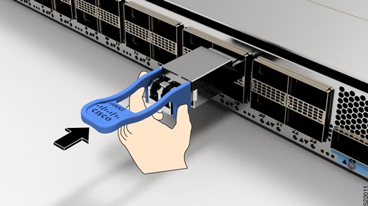 | 6. | Press firmly on the front of the transceiver module with your thumb to fully seat the transceiver in the module’s transceiver socket.