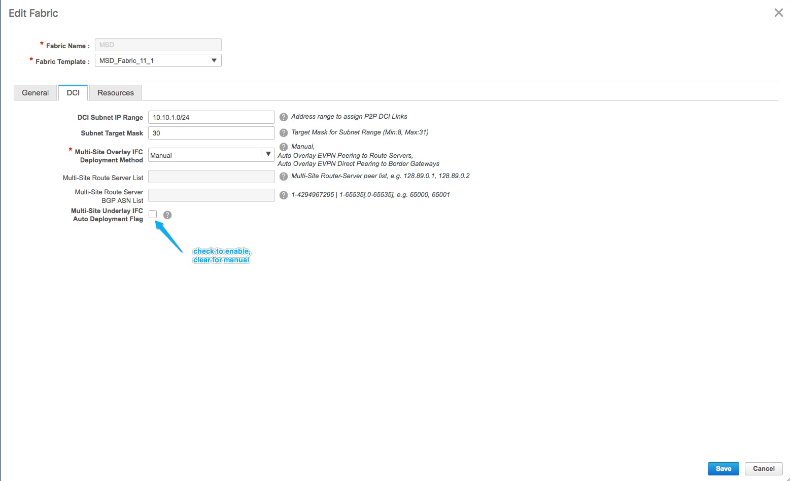 To choose one of the above options, go to the MSD fabric’s settings, select the DCI tab, and set