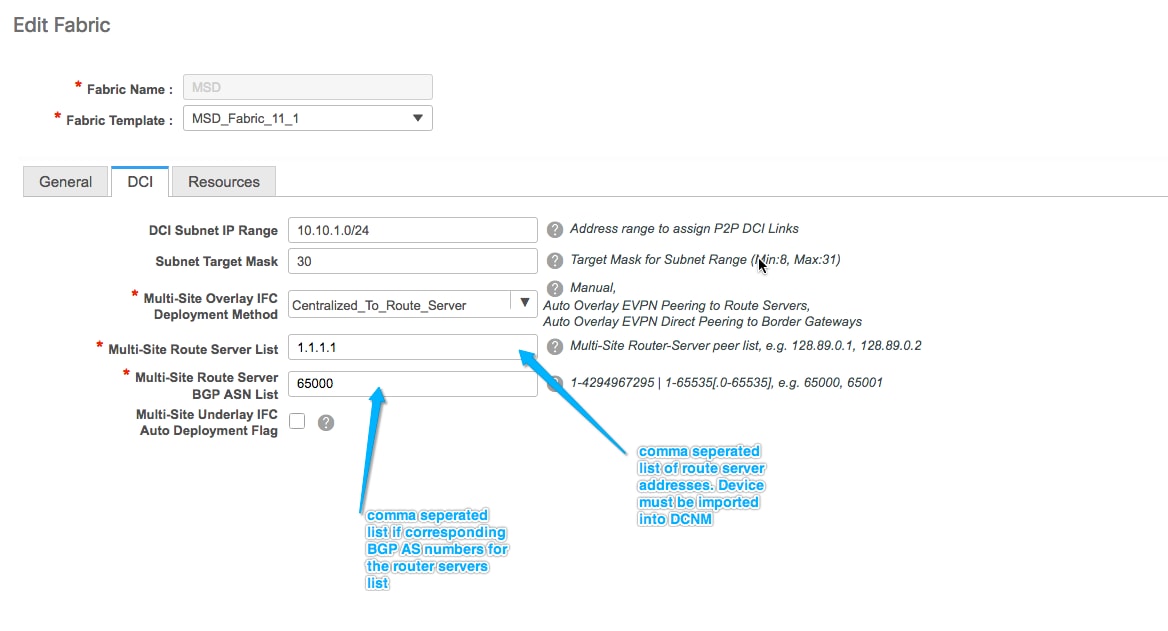 The BGP AS number of each route server should be specified in the MSD fabric settings. Note that the route server AS number