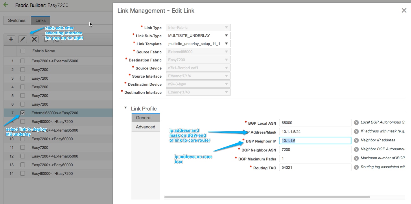 The IFCs needed for deployment of Networks and VRFs at the BGW nodes can be auto configured via the MSD fabric template. The