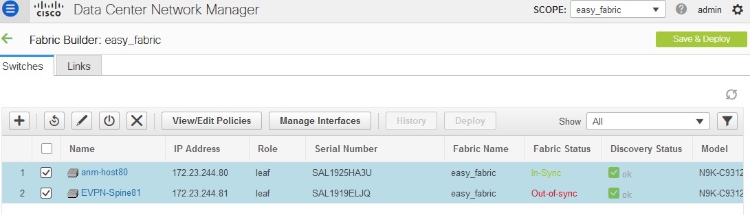 The Save & Deploy option can also be used for deployment. However, the Save & Deploy option will identify mismatch between the intended and running configuration across all fabric switches.