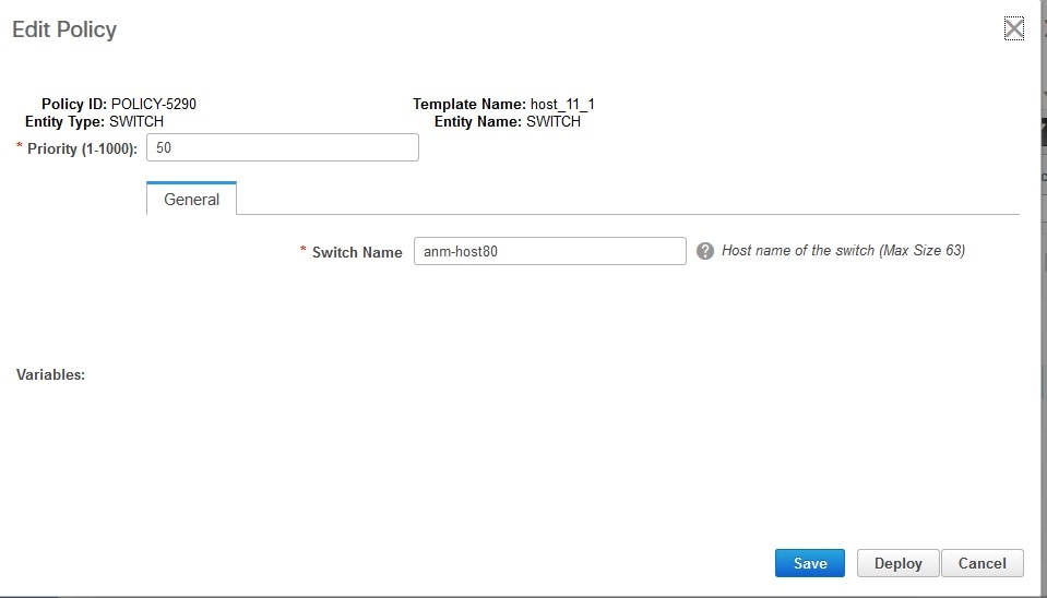 After the policy is updated and saved, right click the device and select the per switch Deploy Config option to deploy the configuration. Alternatively, use the Save and Deploy option in the fabric topology screen (within Fabric Builder) so that the fabric triggers Configuration Compliance and resolves the configuration mismatch.