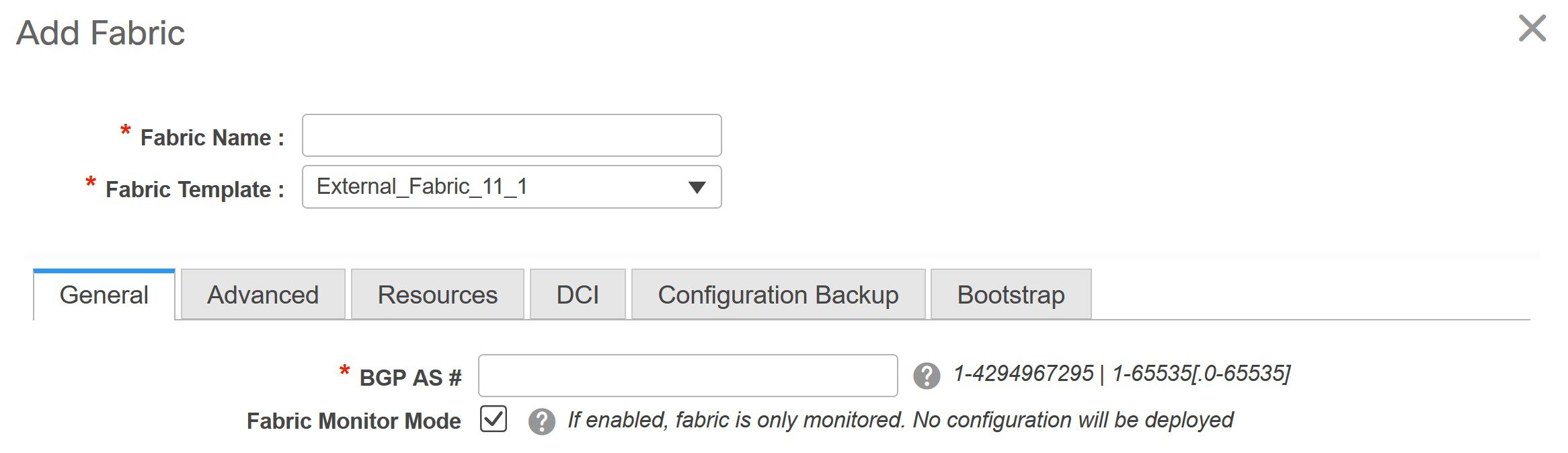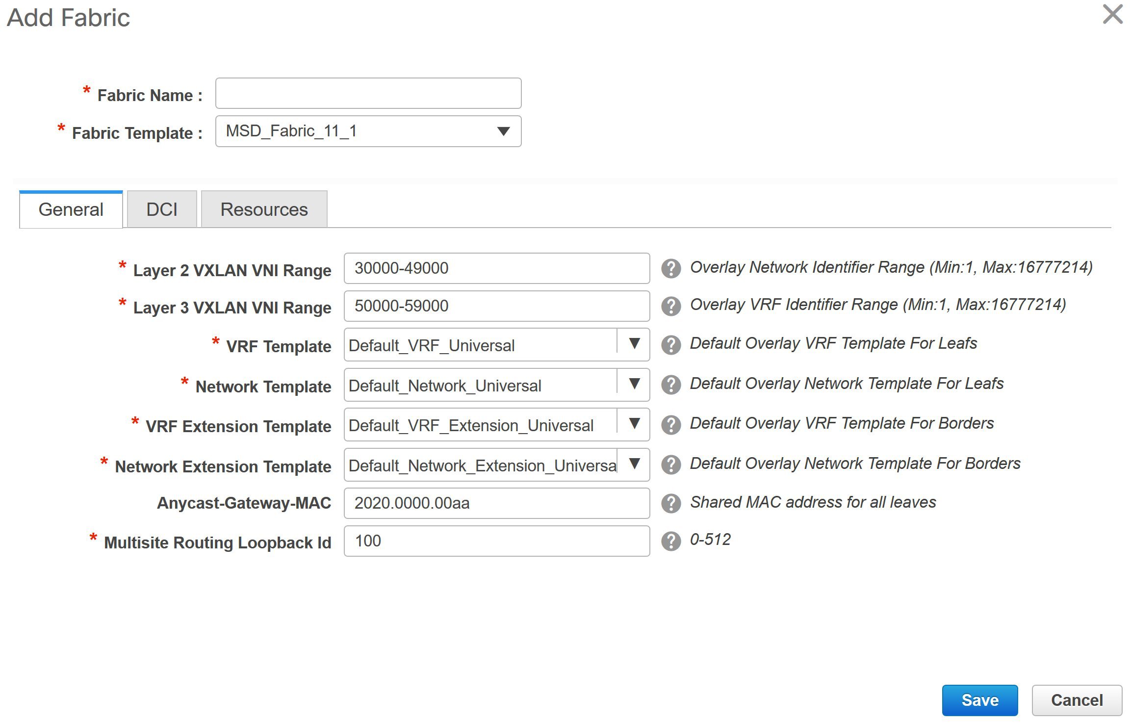Fabric Template - From the drop-down menu, choose the Easy_Fabric_11_1 fabric template. The fabric settings for creating a standalone fabric comes up.