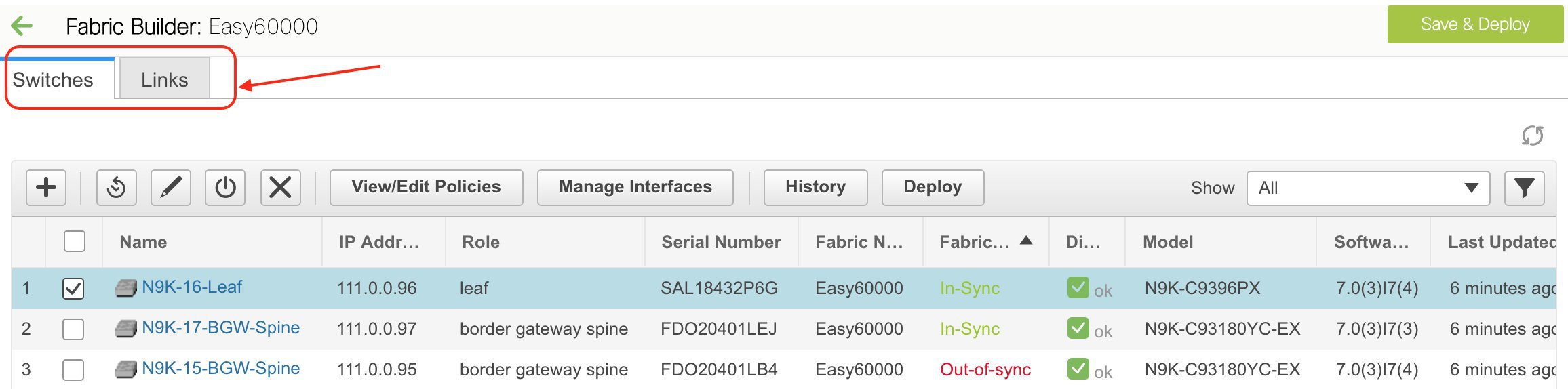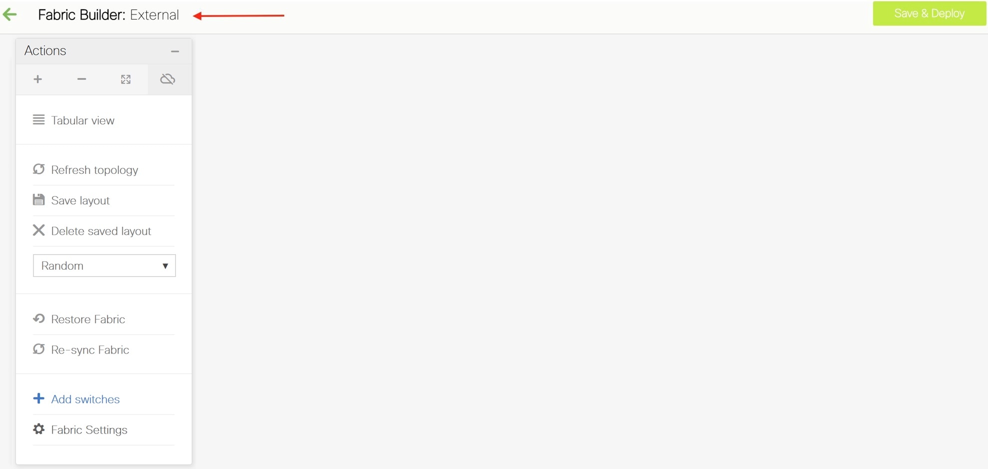 The Save & Deploy button triggers the intent regeneration for the entire fabric as well as a configuration compliance check for all the switches within the fabric. This button is required but not limited to the following cases: