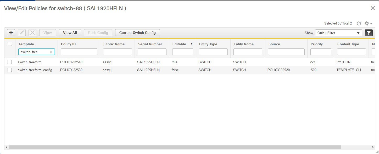 When you edit a switch_freeform policy and deploy it onto the switch, you can see the changes being made (in the Side-by-side tab of the Preview option).