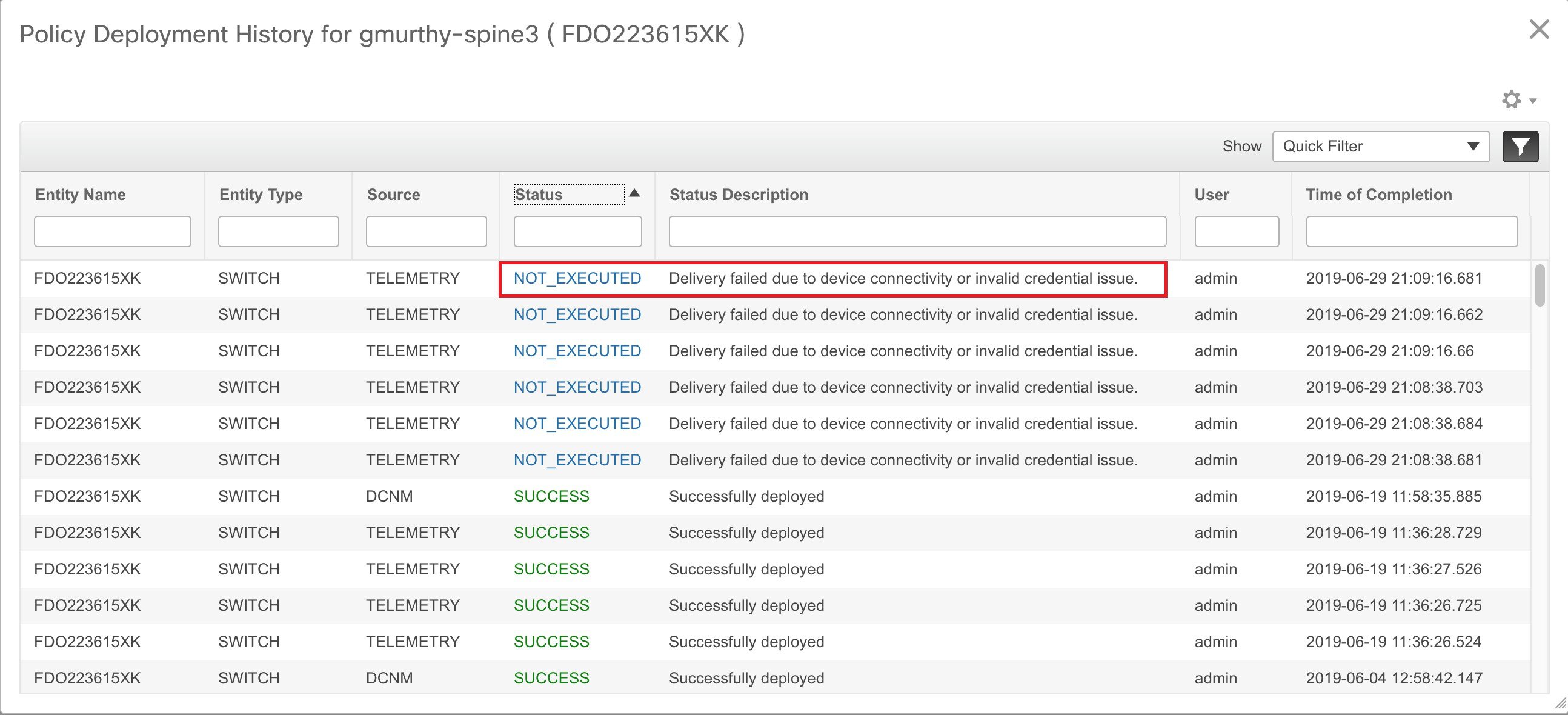 Note that the fabric errors related to the command execution are automatically cleared only when the same failed command succeeds in the subsequent deployment.