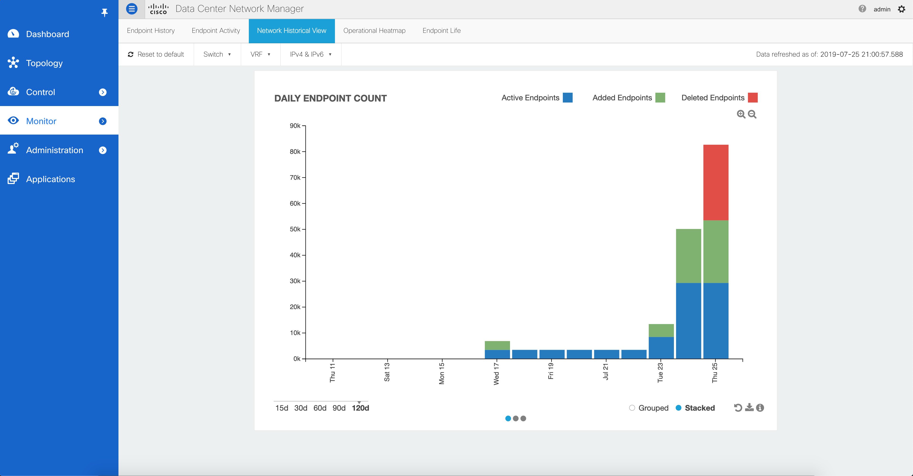 Choose Monitor > Inventory > Switches. The Switches window with a list of all the switches for a selected Scope is displayed. |
