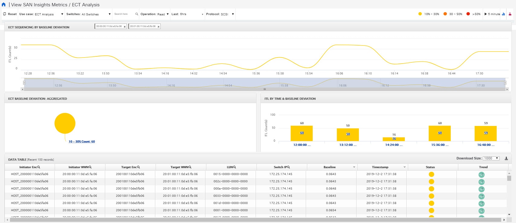 From the Cisco DCNM Web UI > Dashboard > SAN Insights, click on the View SAN Insights Metrics to view the ECT Analysis.