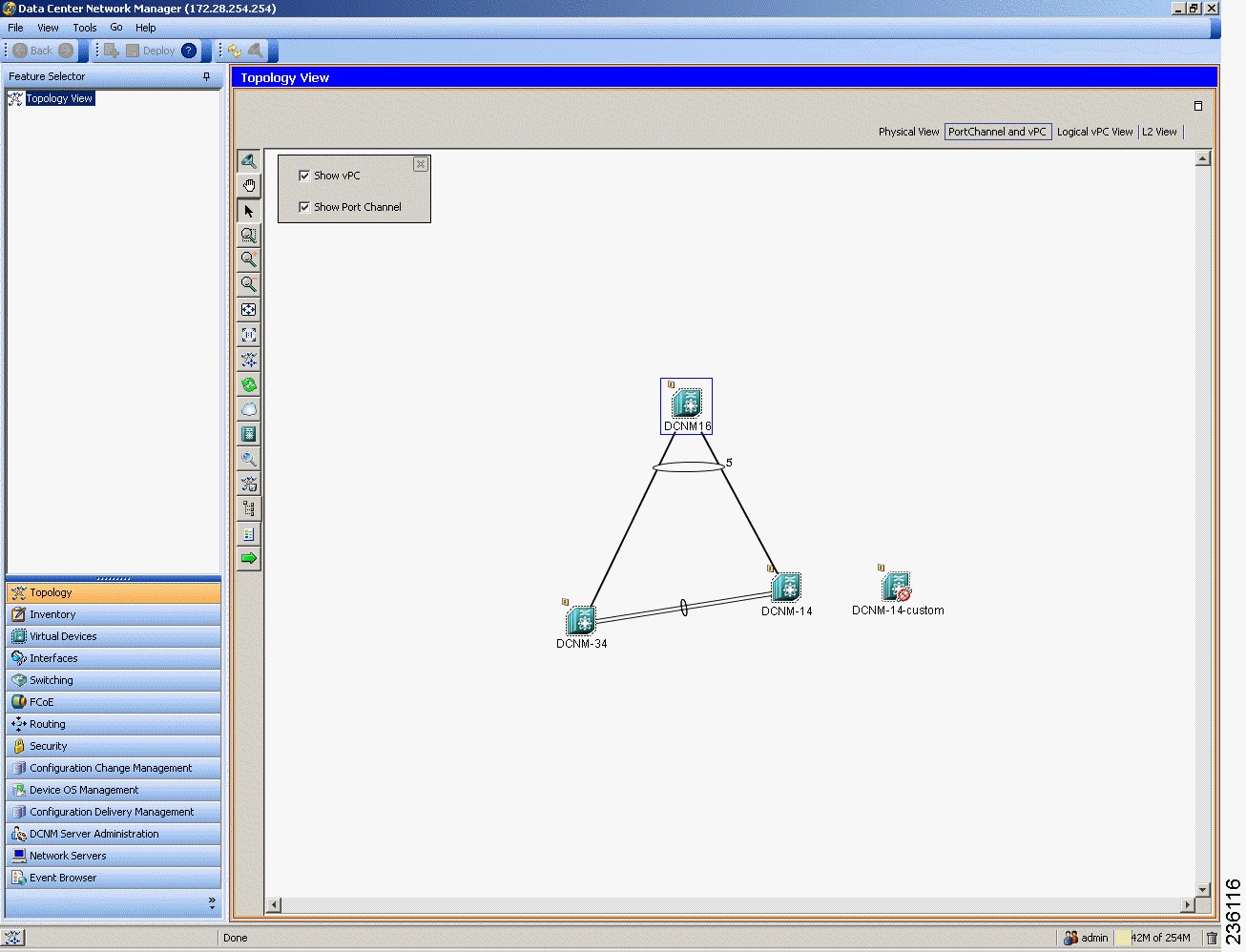 The PortChannel and vPC view (see Figure 8-2) shows all physical connections and all logical connections among discovered devices, including port channel links, virtual port channel (vPC) links, and vPC peer links. Physical links appear in gray in this view.