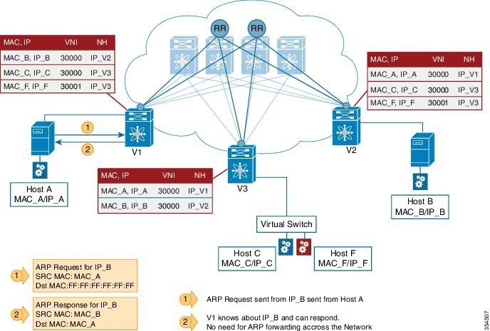 Since the number of end hosts attached to VTEPs in a data center is huge, a mechanism is required to reduce flooding for discovery of end host location and resolution information. This is achieved via MAC/IP binding information distribution.