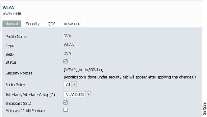 The following example shows how WLAN is configured with the SSID of DVA: