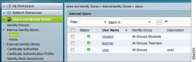 Create the appropriate User Names and Identity Groups. In this example, student and teacher are created as Usernames and similarly All Groups:Students, and AllGroups:Teachers are created as Identity Groups. |